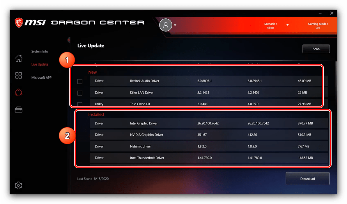 Нажмите на кнопку «Scan», чтобы приложение проверило, какой софт нуждается в обновлении. По завершению сканирования поставьте галочки напротив нужных позиций в разделе «New», затем кликните «Download».