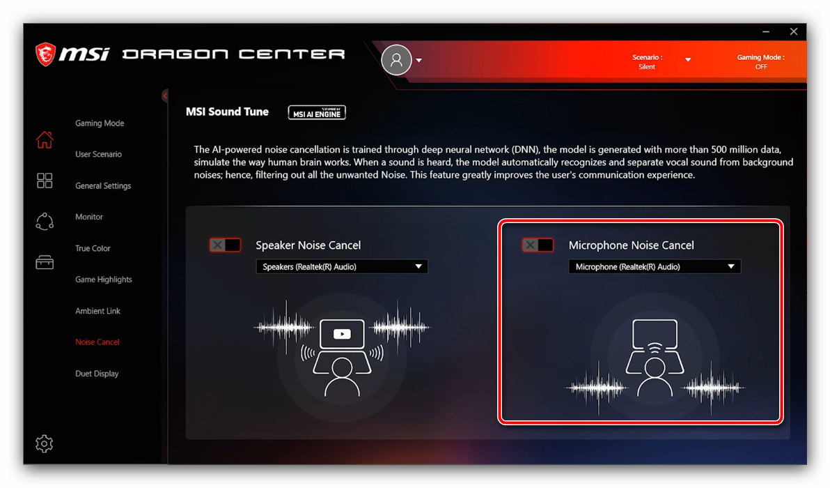 Часть моделей материнских плат MSI для настольных ПК и ноутбуков оборудована встроенной системой шумоподавления, которая работает на нейросетях. Для её включения проделайте следующее: