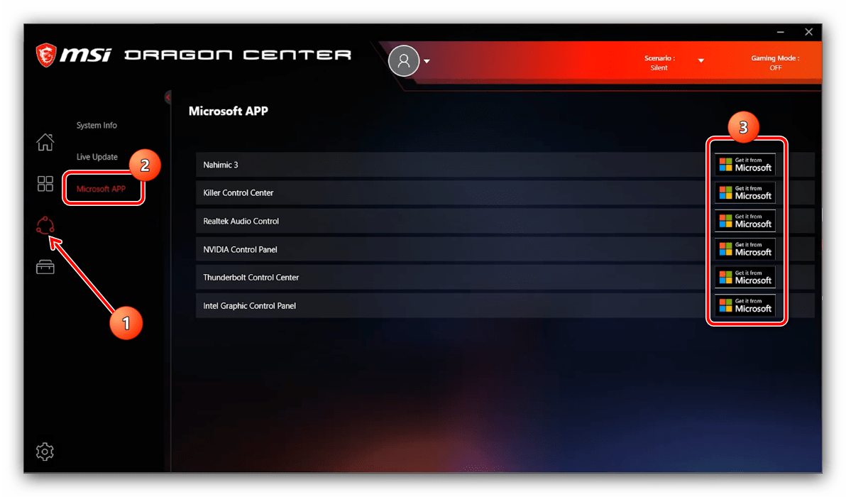 Для установки дополнительного софта откройте вкладку «Microsoft APP». Здесь находится перечень программ, которые можно инсталлировать для увеличения функциональности MSI Dragon Center. Для начала загрузки воспользуйтесь кнопкой «Get it from Microsoft» – после её нажатия откроется Microsoft Store, откуда и происходит загрузка.