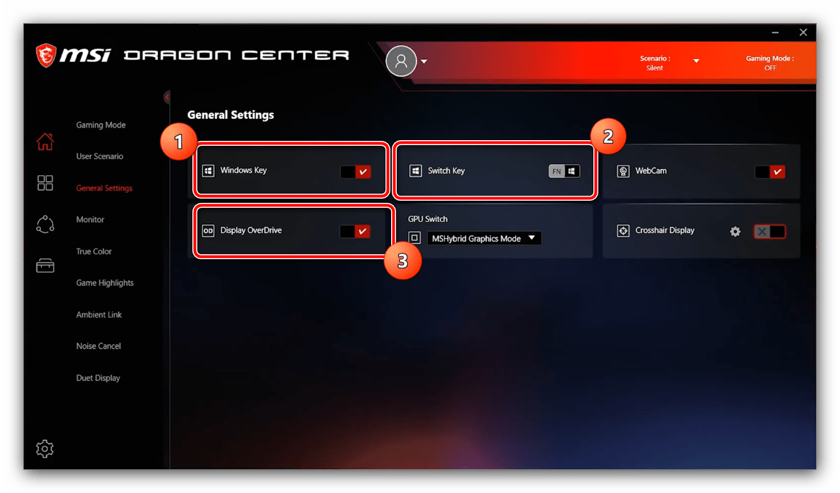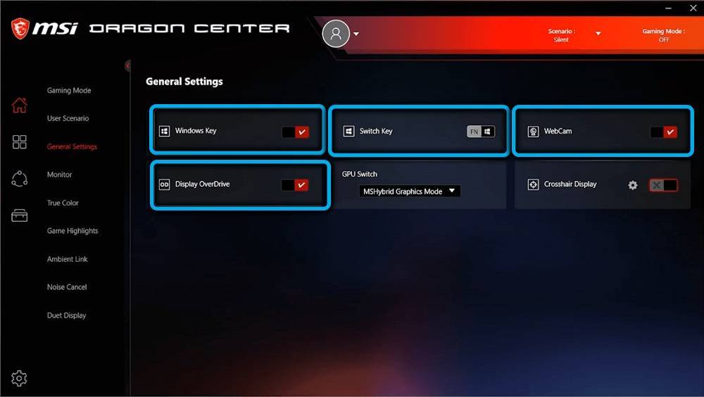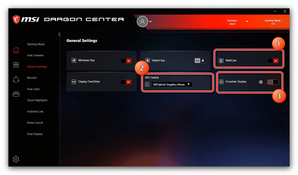 Доступны также опции программной деактивации веб-камеры (переключатель «Webcam»), изменения режима работы GPU (меню «GPU Switch») и включения специального профиля отображения для шутеров от первого лица «Crosshair Display».