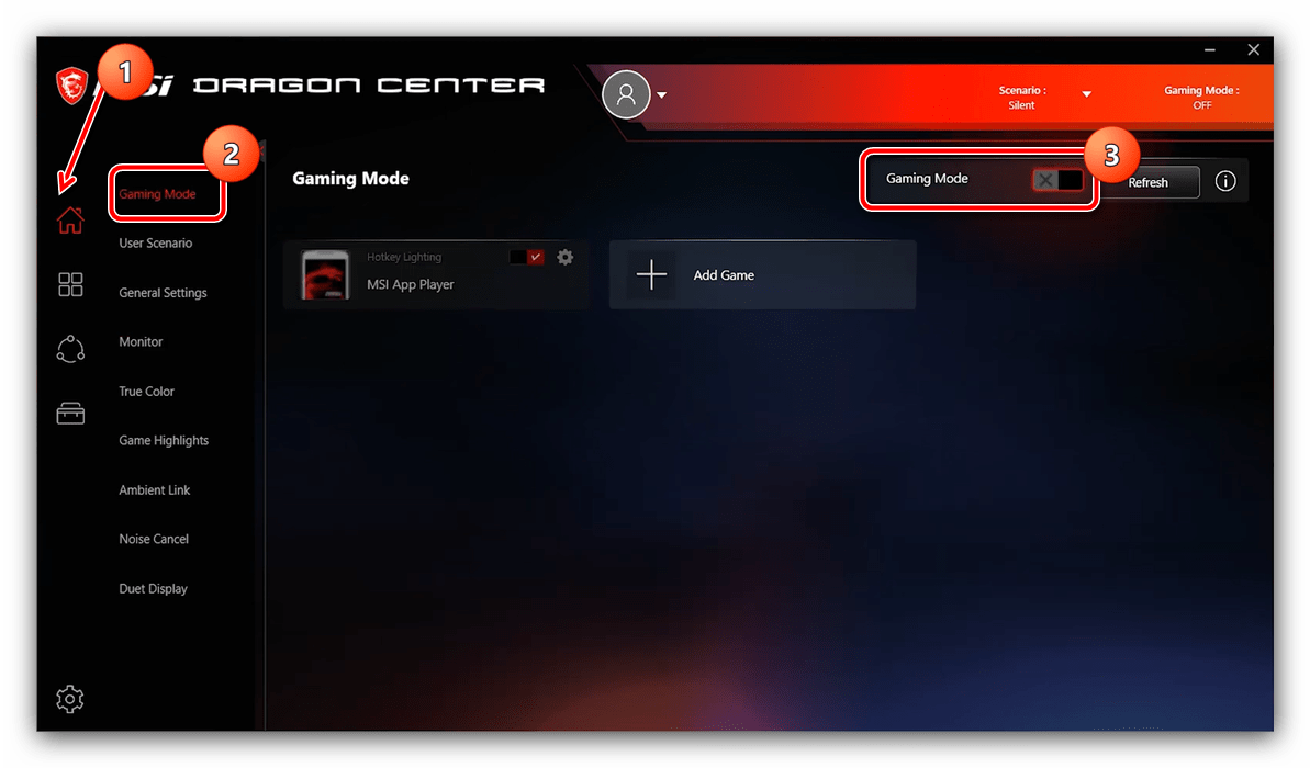 MSI Dragon Center умеет автоматически подбирать сочетание настроек материнской платы и/или установленных на ней системных компонентов для наилучшего игрового опыта — эта функция называется «Gaming Mode». Для её включения перейдите по пути «Домой» — «Gaming Mode» и воспользуйтесь одноимённым переключателем в верхней правой части окна.