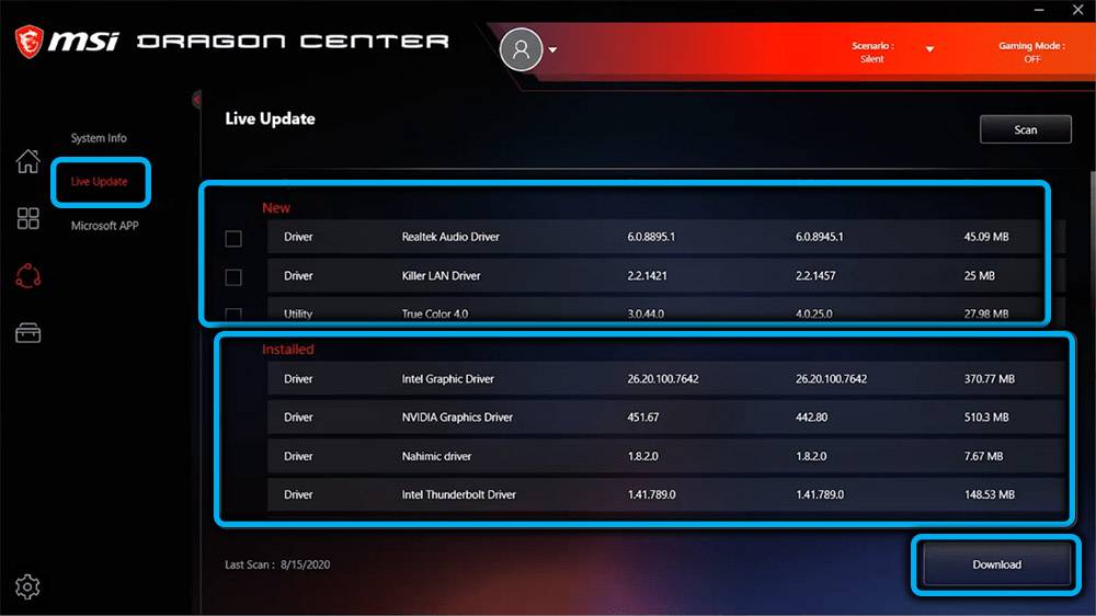 Программа позволяет сделать процесс загрузки драйверов и установки обновления служебного ПО ещё более простым при помощи вкладки «Live Update», которую можно найти в разделе «Поддержка». Выбранная опция покажет список ПО, которые нуждаются в обновлении. Их можно найти под пунктом «New», где нужно будет проставить галочки и начать загрузку обновлений при нажатии на «Download».