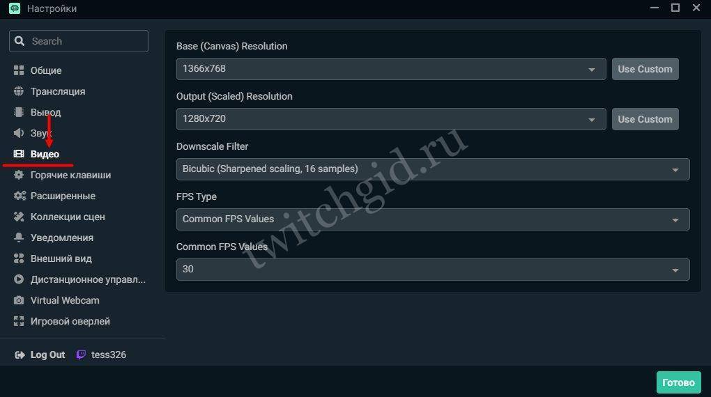 Продолжаем настройку Стрим лабс ОБС – на очереди вкладка «Видео». Здесь параметров немного: