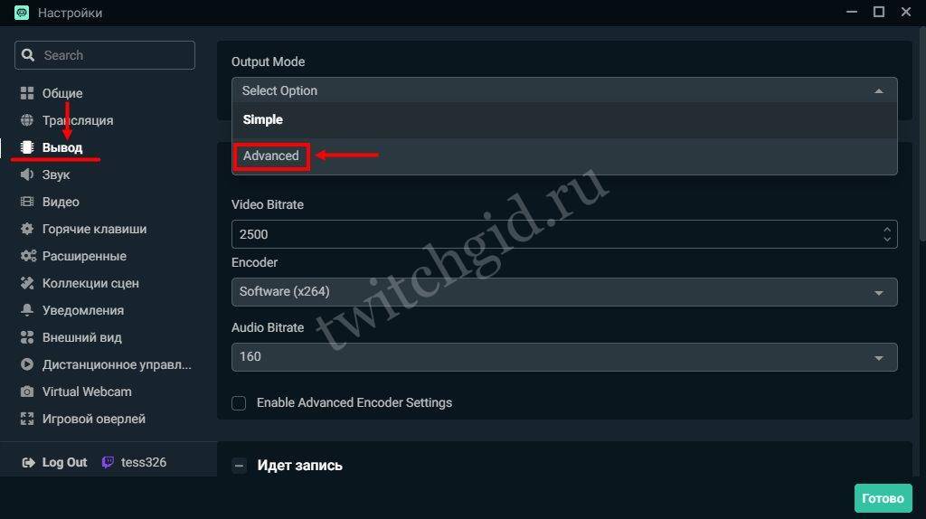 - Во вкладке «Вывод» выбрать «Режим вывода – расширенный» и в подразделе «Потоковое вещание» выбрать кодировщик NVENC H.264, если слабый процессор (это запускает трансляцию через видеокарту).