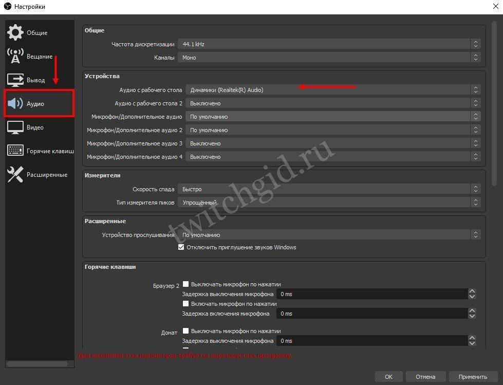 Внимание. В настройках в графе «Аудио» настраивается звук и микрофон для вашей записи или трансляции