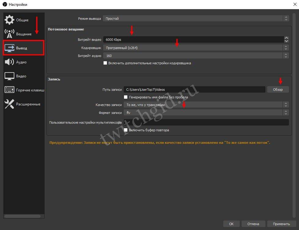 Внимание. Если после установки таких настроек видео или трансляция работают некорректно, то ваш компьютер не поддерживает программу OBS