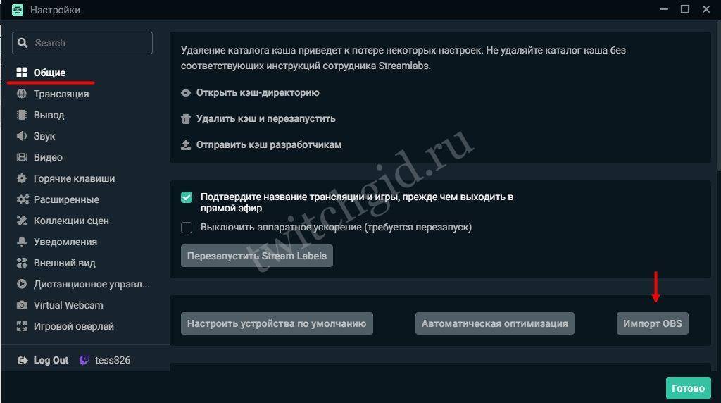 Здесь вы можете импортировать настройки из OBS Studio, просто нажмите на соответствующую кнопку;