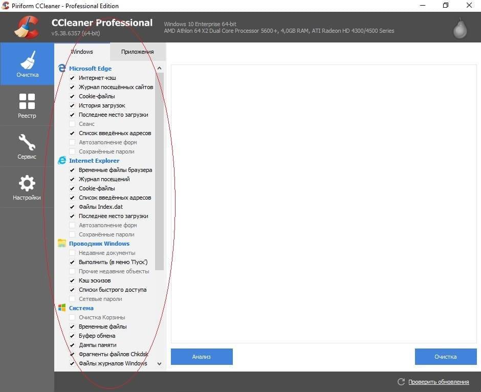 Настройка очистки в CCleaner