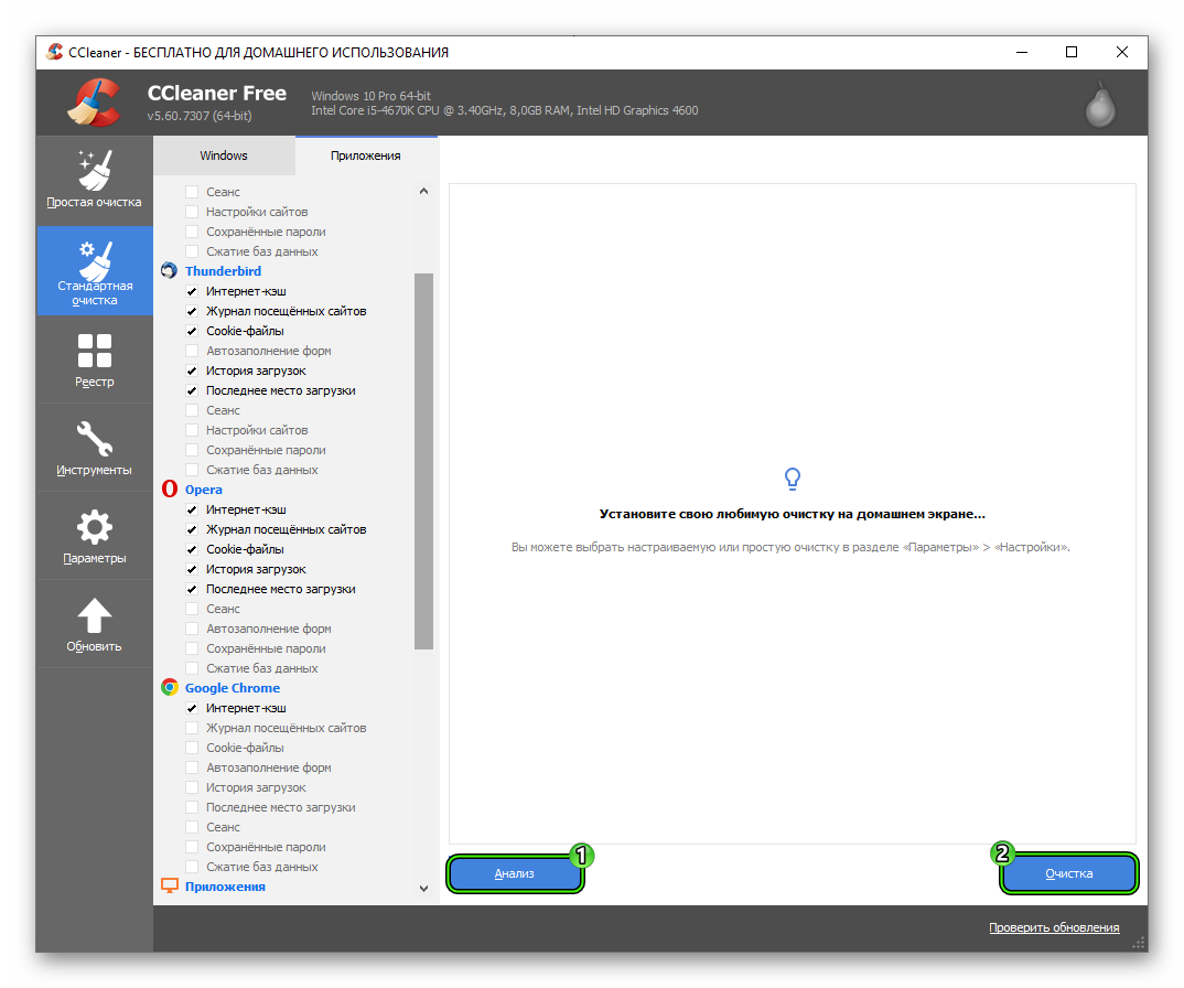 Следующий инструмент – «Стандартная очистка» — предназначен для более опытных юзеров. Он состоит из двух подразделов – «Windows» и «Приложения». Здесь необходимо отметить, какие компоненты системы и приложения нужно очистить. Кнопка «Анализ» запускает процесс, а «Очистка» после его завершения – удаляет обнаруженный системный мусор.