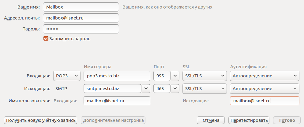 - Имя сервера — pop3.mesto.biz