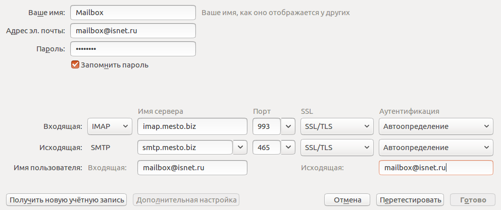 - Имя сервера — imap.mesto.biz