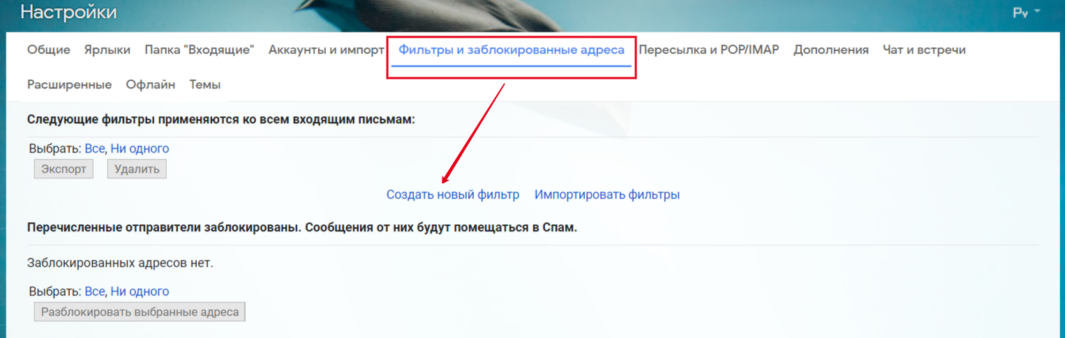 Фильтры настраиваются как вместе с переадресацией, так отдельно. Для этого откройте настройки → Все настройки → Фильтры и заблокированные адреса → Создать новый фильтр.
