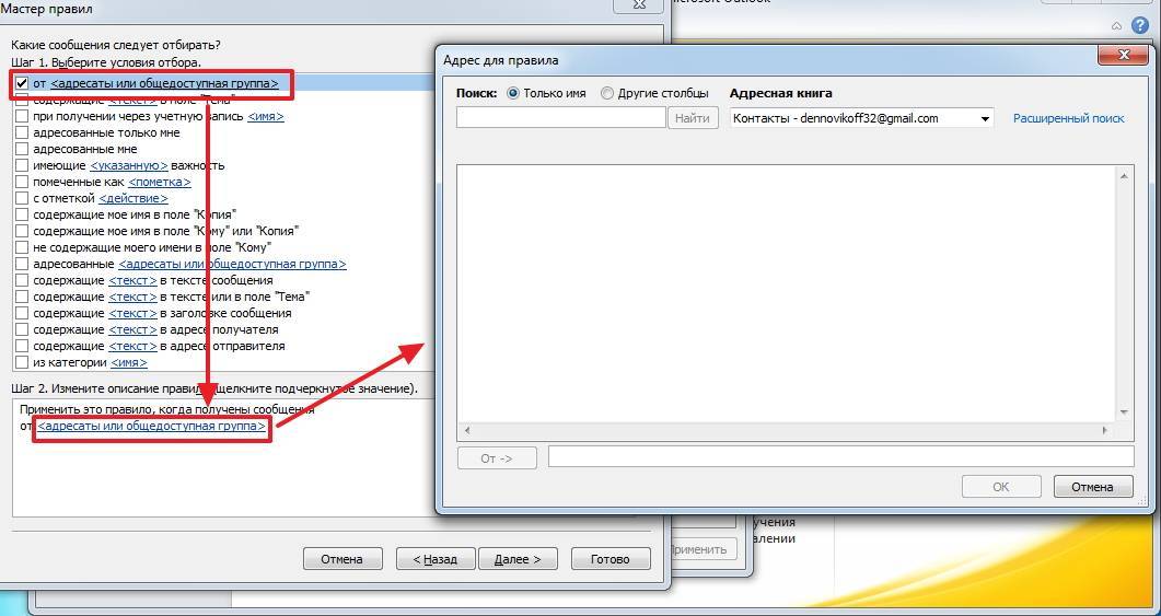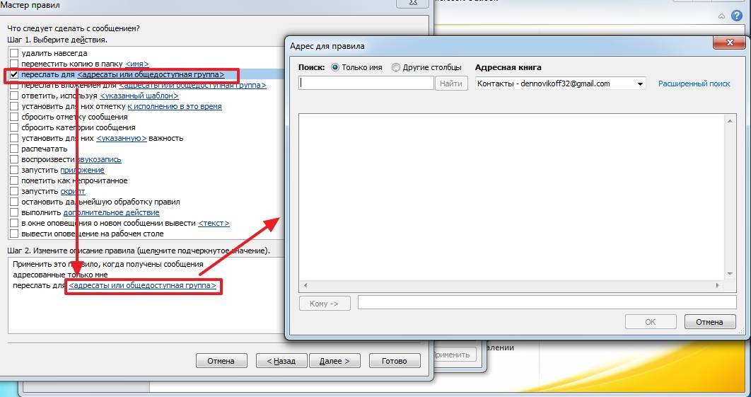 К примеру, если вы хотите переадресовывать письма от конкретных адресатов, то в этом случае следует отметить пункт «от ». Далее, в нижней части окна, необходимо кликнуть по одноименной ссылке и выбрать необходимых адресатов из адресной книги.