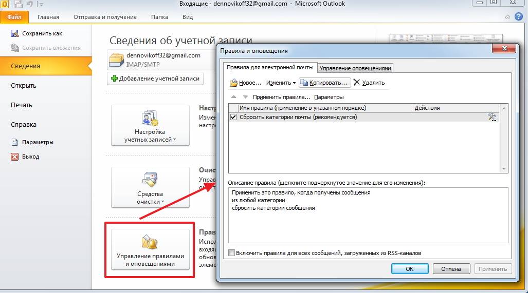 Для создания нового правила, необходимо зайти в меню «Файл» и кликнуть по кнопке «Управление правилами и оповещениями».