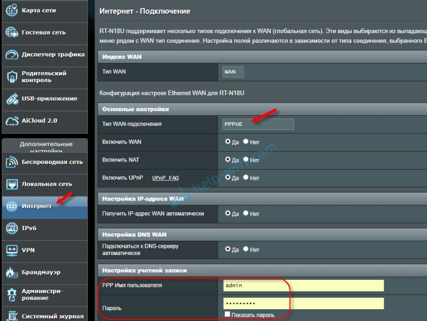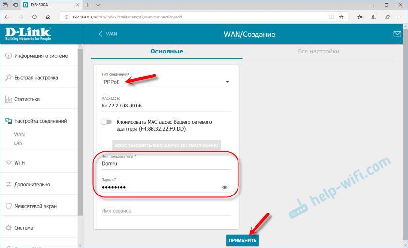 Там все стандартно. Тип подключения – PPPoE. Заполняем поля «Имя пользователя» и «Пароль». Напомню, что эти данные выдает интернет-провайдер. В нашем случае это Дом.ру. Не забываем сохранить настройки.