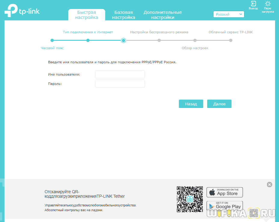 На втором шаге ставим в качестве «Типа подключения к Интернет» PPPoE Россия
