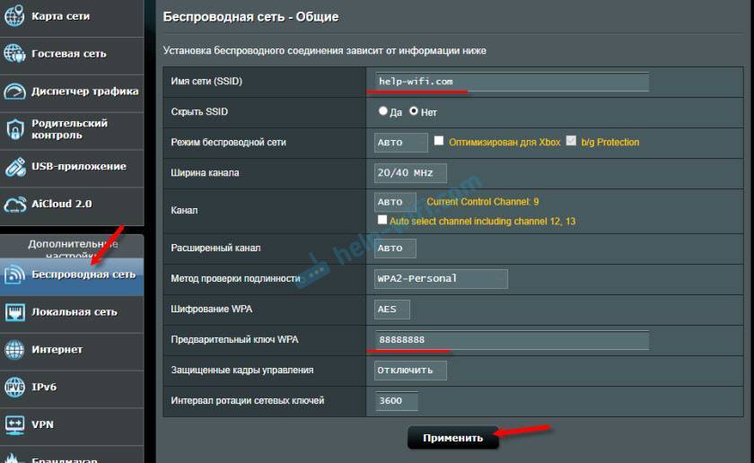 Настройка Wi-Fi сети и пароля в разделе «Беспроводная сеть».
