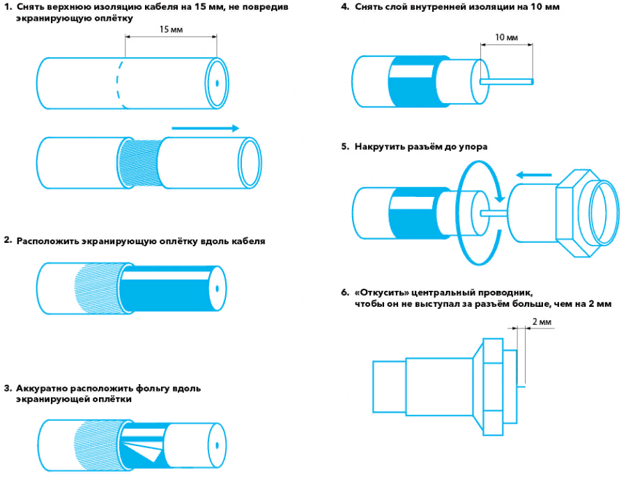 - К антенному кабелю прикрепите F-разъем так, чтобы он плотно прилегал к оплетке.