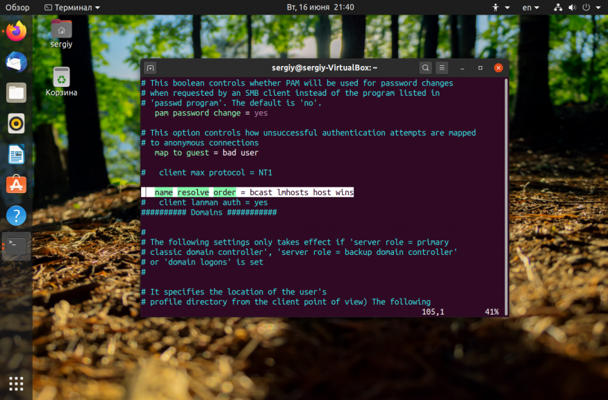 Неверный порядок разрешения сетевых имен тоже может стать проблемой. Чтобы исправить его найдите в smb.conf параметр и приведите его к такому виду: