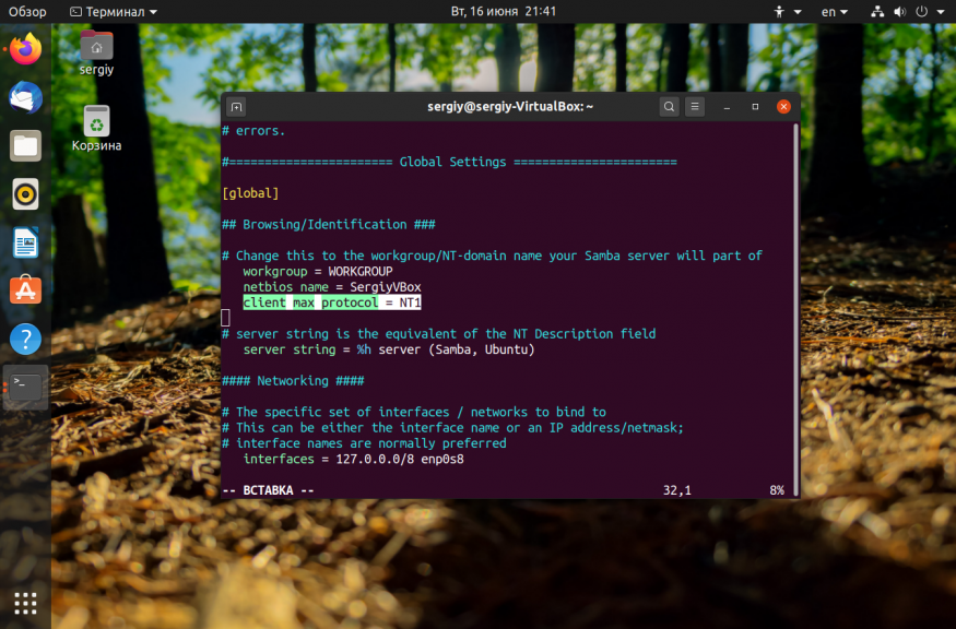 Затем найдите в /etc/samba/smb.conf параметр interface и замените в его значении eth0 на имя вашего интерфейса, который обеспечивает связь с нужной локальной сетью. Например на enp0s8: