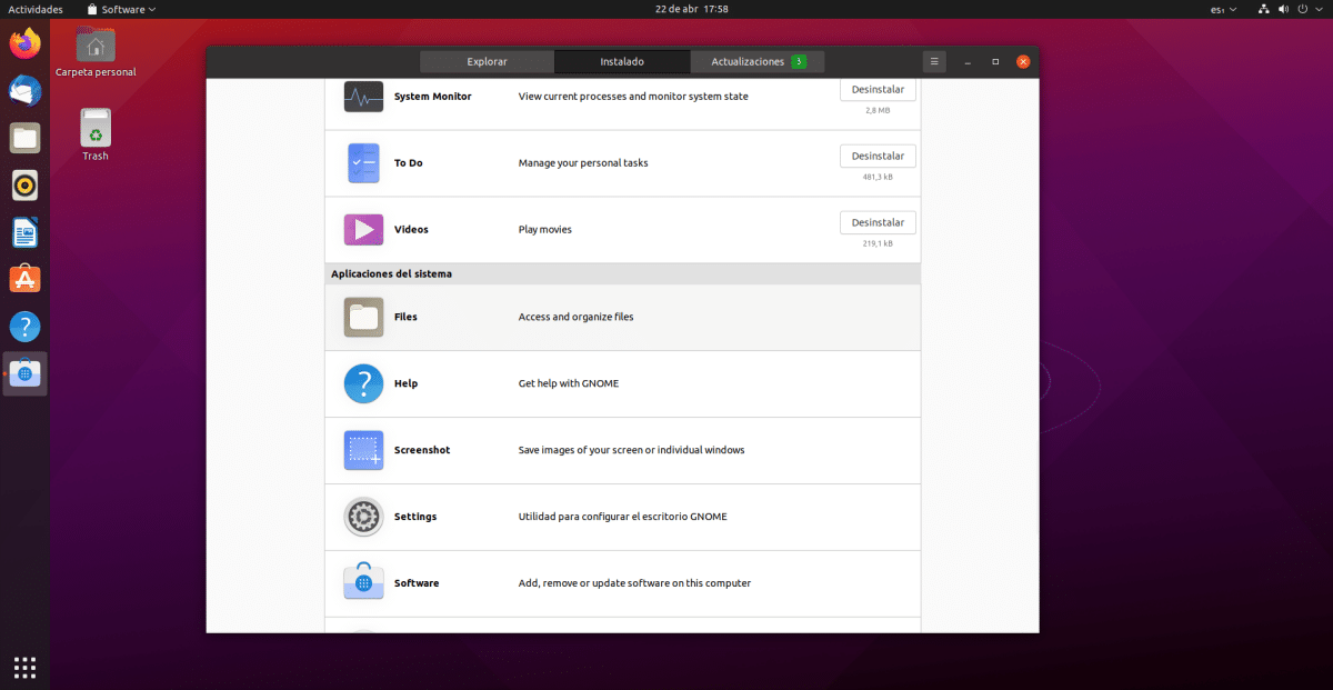 Для некоторых первым шагом должна быть проверка наличия обновлений и их установка. Для меня это тоже то, что мы должны делать сначала, но после устранения того, чего мы не хотим. И в том, что если мы обновляем напрямую, пакеты, которые нам не нужны, также будут обновлены, поэтому время, которое мы потеряем, будет больше. Так что лучше всего начните с удаления программного обеспечения что мы не хотим, что также проще для меня в программном обеспечении GNOME. Для этого открываем магазин приложений, переходим во вкладку «Установлено» и удаляем то, что нам не нужно.