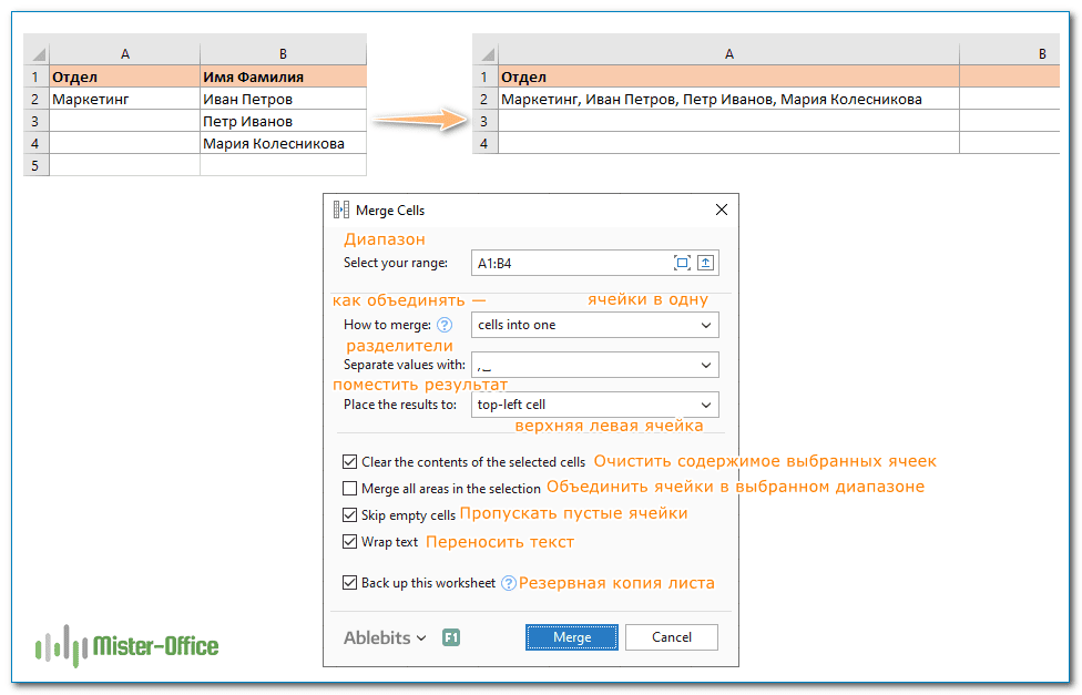 Надстройка Merge Cells — способ объединения ячеек, столбцов или строк в Excel без формул