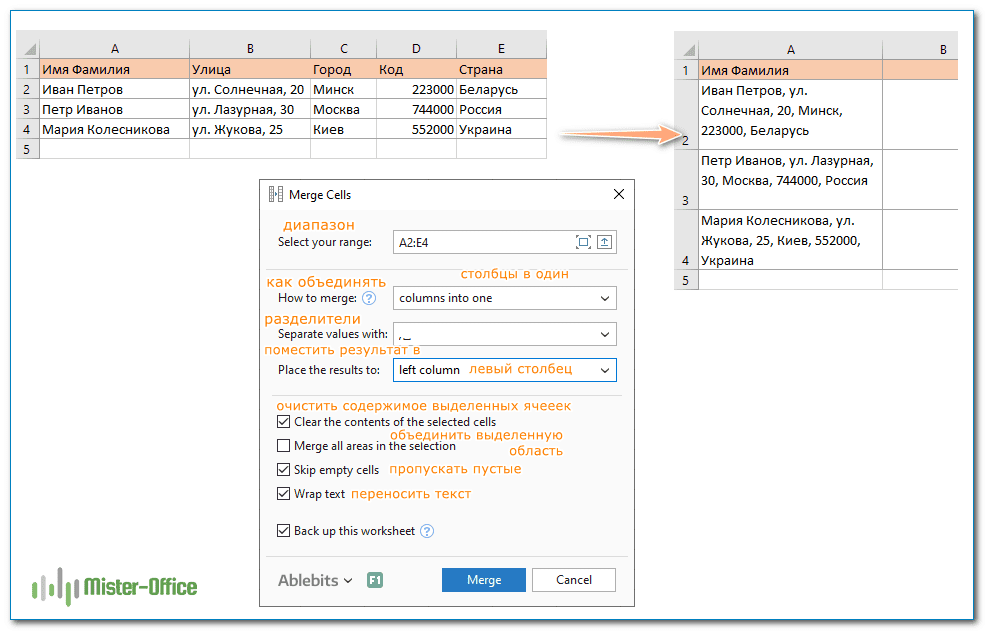 С помощью надстройки Merge Cells, входящей в Ultimate Suite for Excel , вы можете быстро и эффективно выполнить следующие действия: