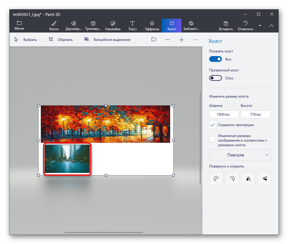 Увеличьте размер холста так, чтобы другое изображение тоже поместилось при соединении (этот параметр можно менять в любой момент). Обязательно снимите галочку с пункта «Изменение размера изображения в соответствии с размером холста».