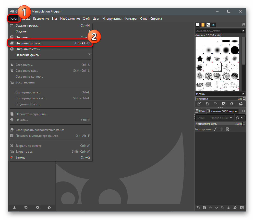 - После запуска программы наведите курсор на «Файл» и из появившегося меню найдите пункт «Открыть как слои».