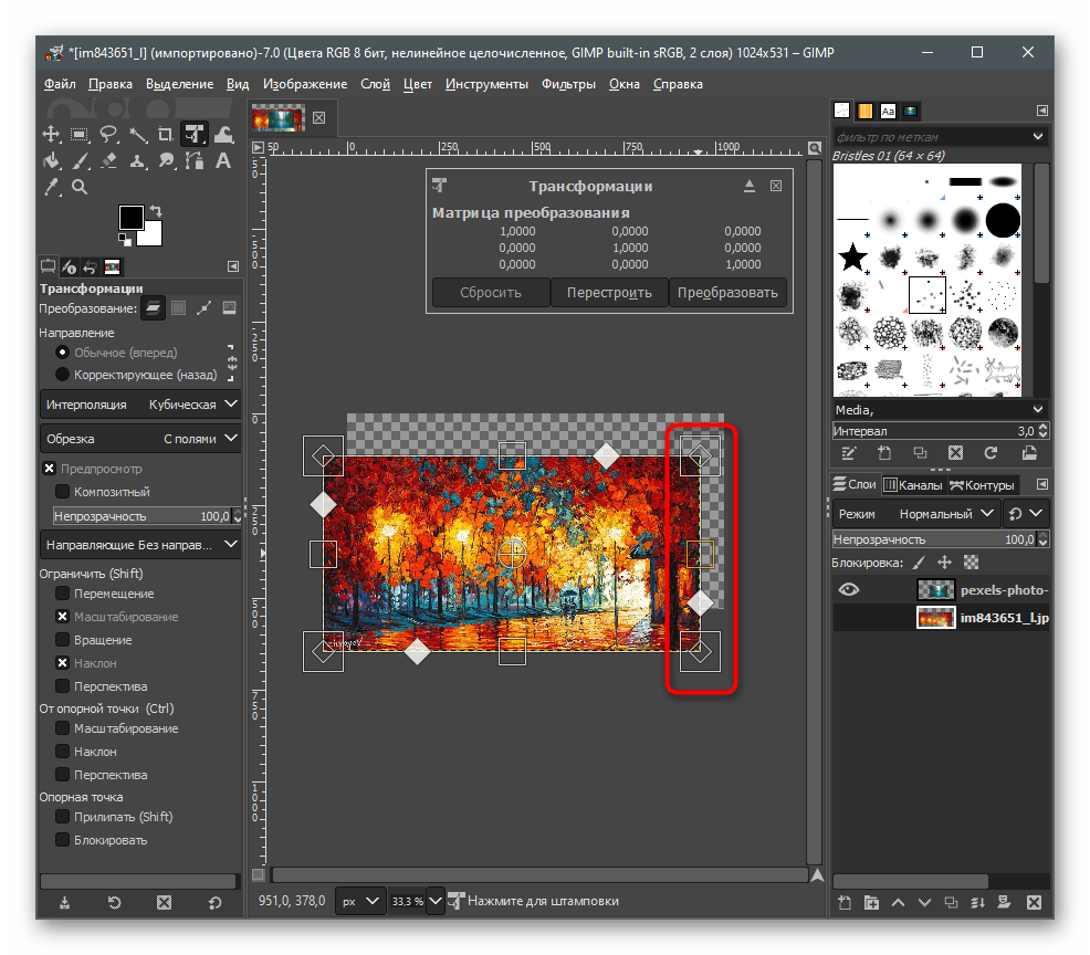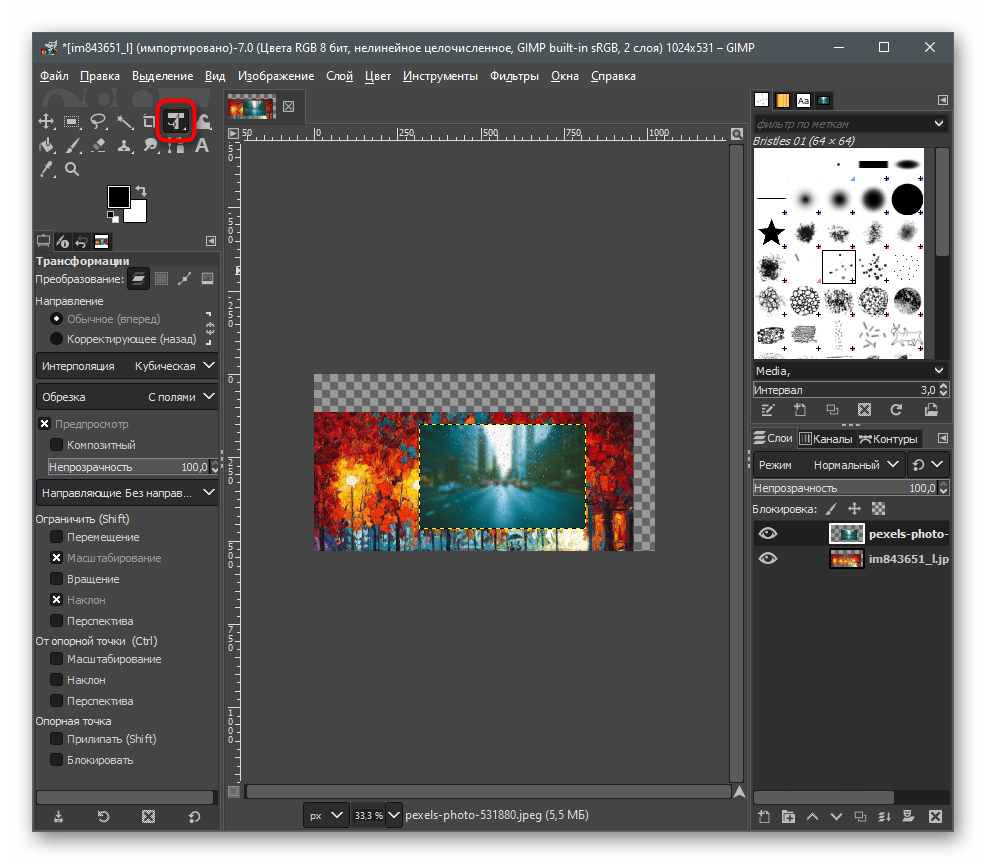 Используйте для этого инструмент «Трансформирование», выбрав его на соответствующей панели.