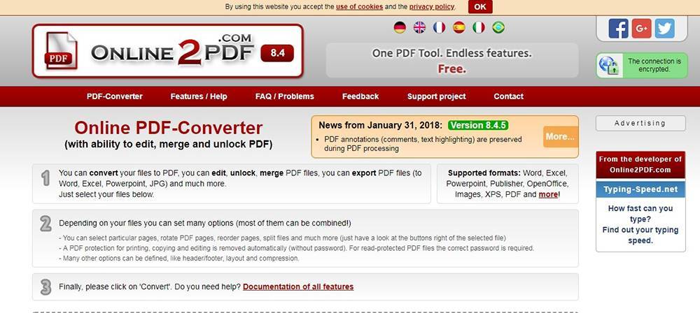 Online2PDF – полностью бесплатный сервис, который дает возможность изменять, разблокировать, объединять и разъединять pdf-файлы онлайн.