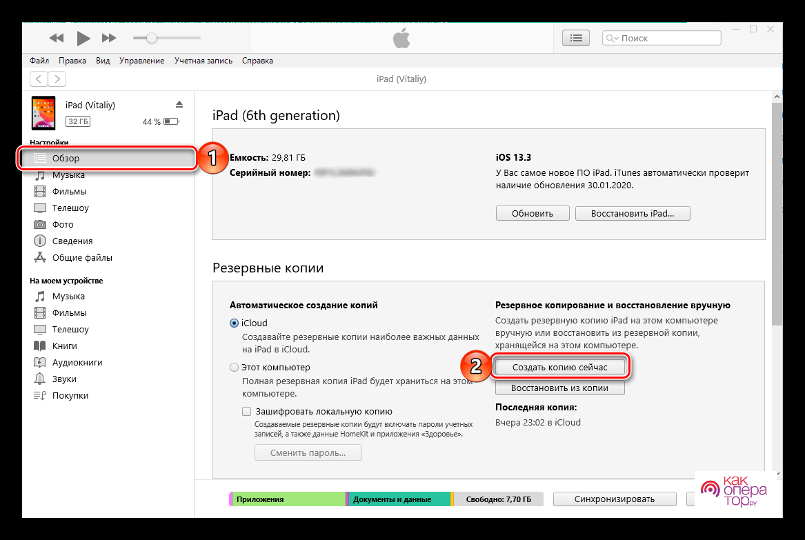 Вряд ли пользователь захочет лишиться своего контента, какой-то важной информации, хранящейся на iPad. Потому первое, что нужно сделать, это создать резервную копию