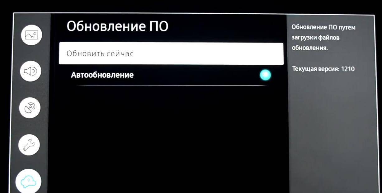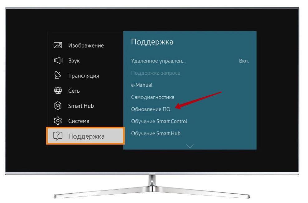 Для этого на телевизоре зайдите «Меню» — «Поддержка» — «Обновление ПО».