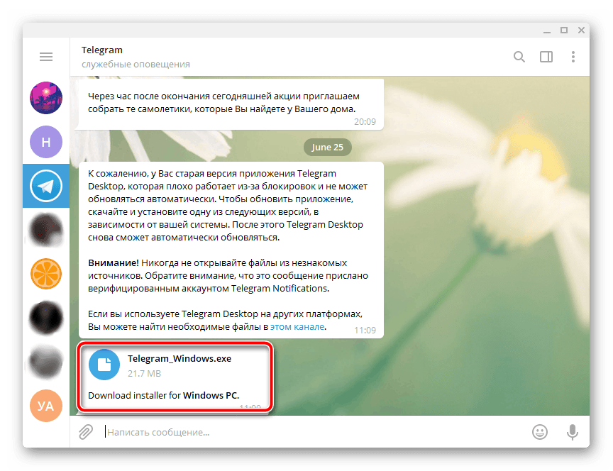 В случае когда обновление таким способом невозможно по каким-либо причинам, рекомендуем просто загрузить и установить свежую версию Telegram Desktop с официального сайта. Кроме этого у некоторых пользователей старая версия Telegram плохо работает из-за блокировок, вследствие чего не может обновляться автоматически. Ручная инсталляция свежей версии в таком случае выглядит так: