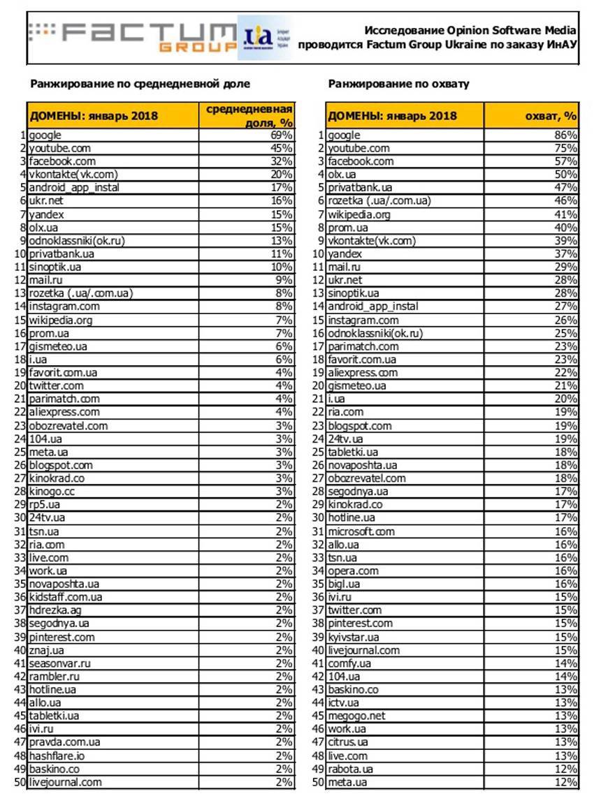На конец февраля 2018 года «ВКонтакте», «Одноклассники» и «Яндекс» попали в 10-ку самых популярных веб-сайтов, которыми пользуются украинцы — об этом сообщили ребята из аудиторской компании Factum Group.