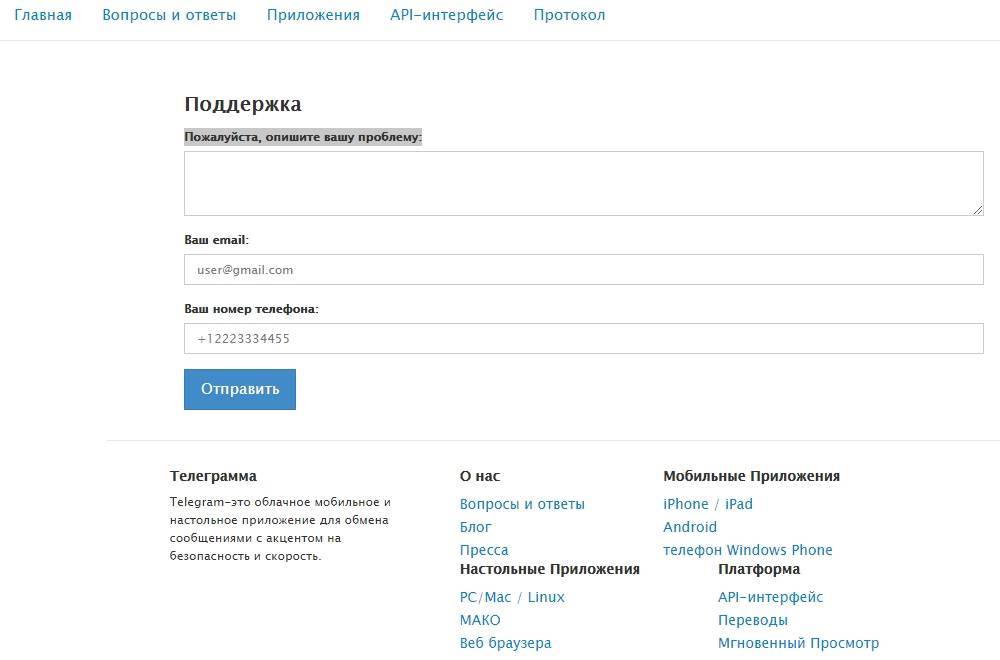 Особенности использования формы заключаются в том, что это официальная техподдержка Телеграмма, но она не имеет русского функционала. Для ее заполнения потребуется ввод описания проблемы на английском языке.