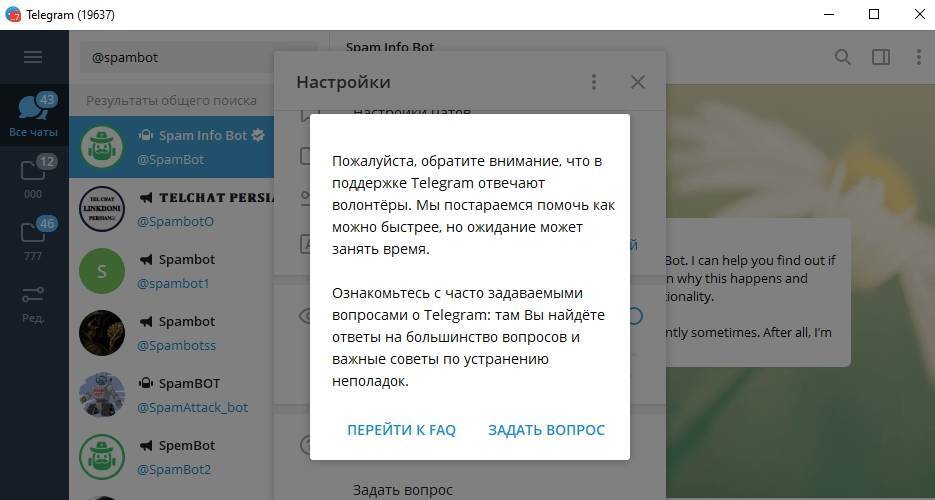Далее последует уведомление о том, что ответ вы можете получить не сразу, работают над разделом техподдержки Телеграмма на русском в приложении волонтеры. И возможно, вас заинтересуют «Часто задаваемые вопросы» (Telegram FAQ) для поиска решения проблемы. Напоминаем Telegram FAQ англоязычный.