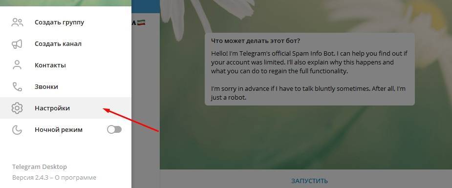 Способ подойдет, если проблема не связана с входом в аккаунт, и вы можете запустить Телеграмм на смартфоне или desktop-версию. Отличается от официальной формы возможностью изложить суть вопроса русским языком. Для этого нужно открыть боковое меню и перейти в раздел «Настройки».