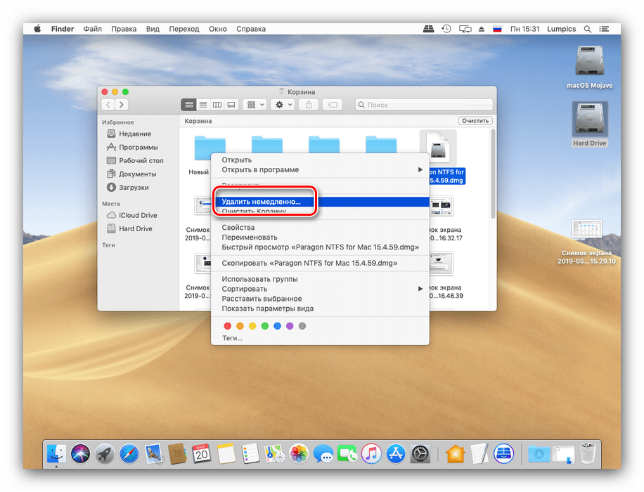 Также из-за защищённых файлов может не работать процедура удаления их из корзины. Процедуру можно выполнить с зажатой клавишей Option: зажмите её, затем используйте пункт контекстного меню «Очистить корзину».