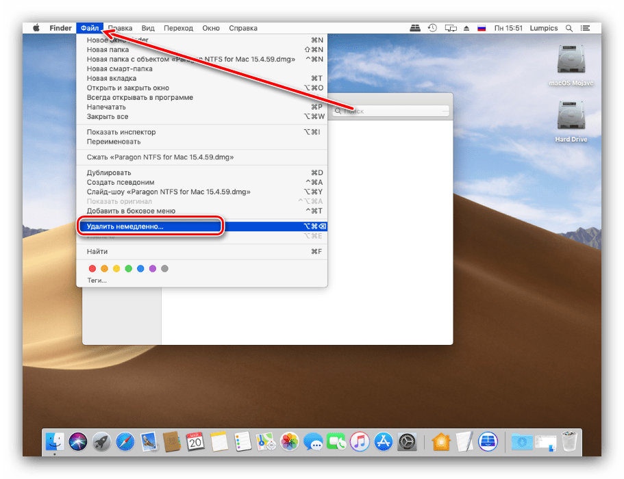 - Зажмите клавишу Option, затем откройте пункт строки меню «Файл», и выберите вариант «Удалить немедленно».