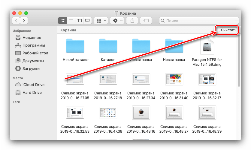 Откроется окно, похожее на стандартный Finder, в котором будет отображено пространство «Корзины». Полное удаление содержимого этого пространства доступно по специальной кнопке.
