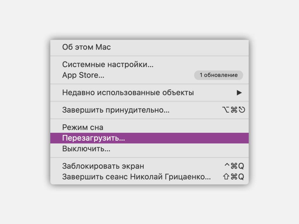 Шаг 2. Перезагружаем Mac: открываем системное меню (логотип Apple в левой части строки меню) и выбираем «Перезагрузить».