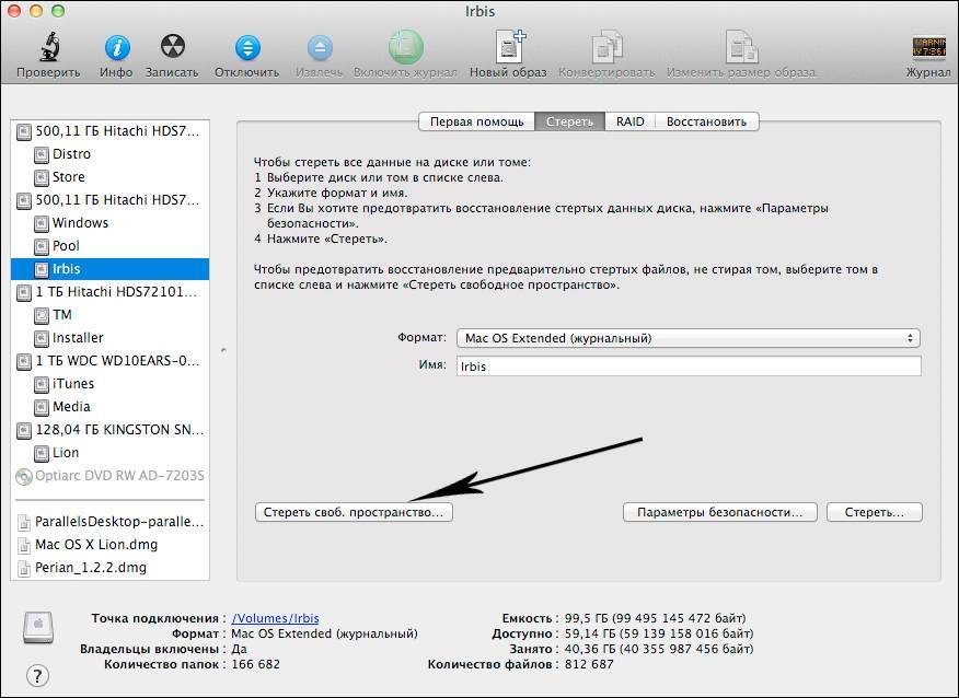 А также вы можете воспользоваться и такой кнопкой, как «Стереть свободное пространство». В этом случае процесс стирания будет распространяться не на весь диск, а только на его незанятую часть.