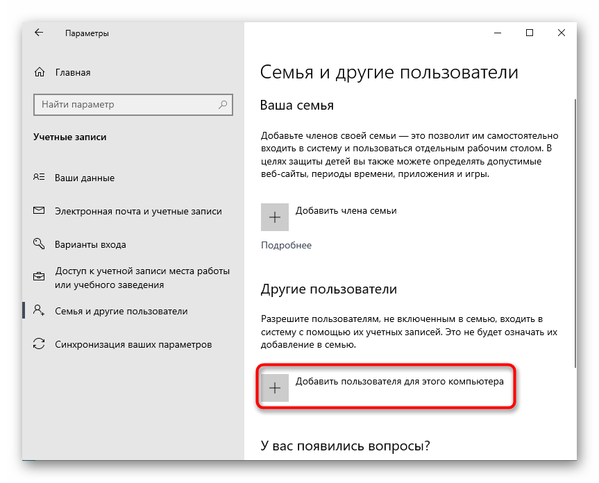 Закройте браузер и вернитесь к окну «Параметры». Как видно, профиль ребенка здесь больше не отображается. Теперь вам нужно нажать на «Добавить пользователя для этого компьютера».