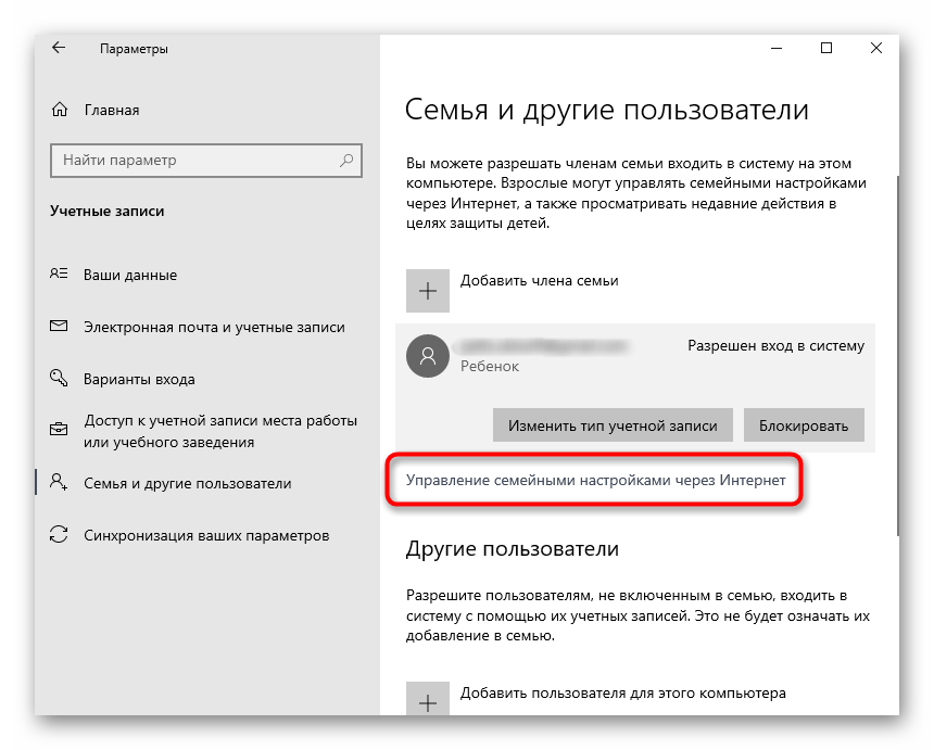 - В том же меню «Учетные записи» нажмите по надписи «Управление семейными настройками через Интернет», чтобы открыть страницу с параметрами.