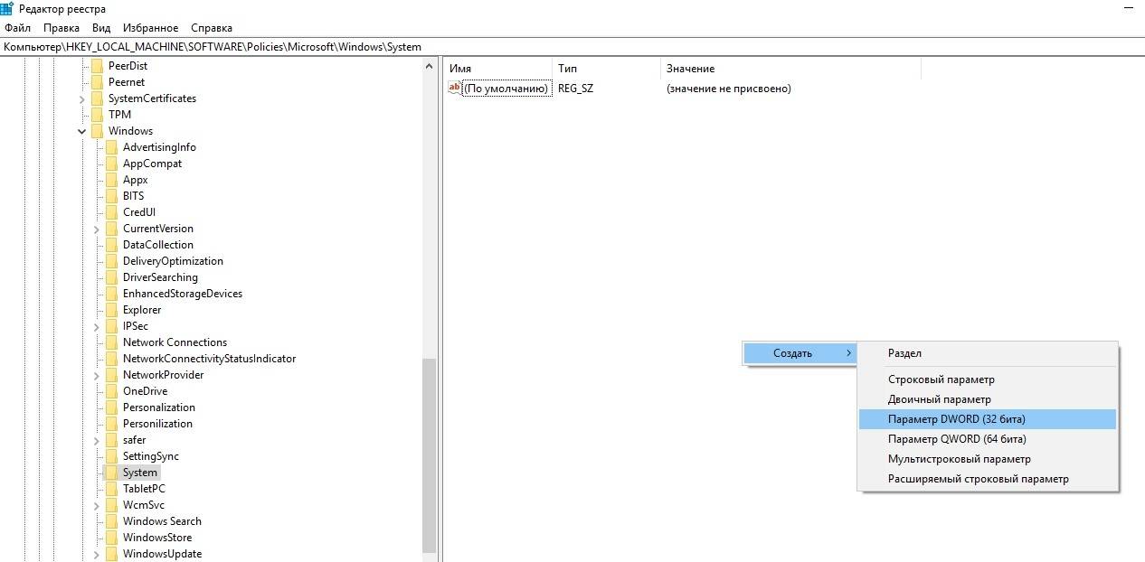 - Выберите только, что созданный каталог «System» и в правой панели создайте новый параметр DWORD (32-бита) с именем «EnableSmartScreen», для этого нажмите в любом свободном месте правым кликом и выберите опцию «Создать -> Новый параметр DWORD».