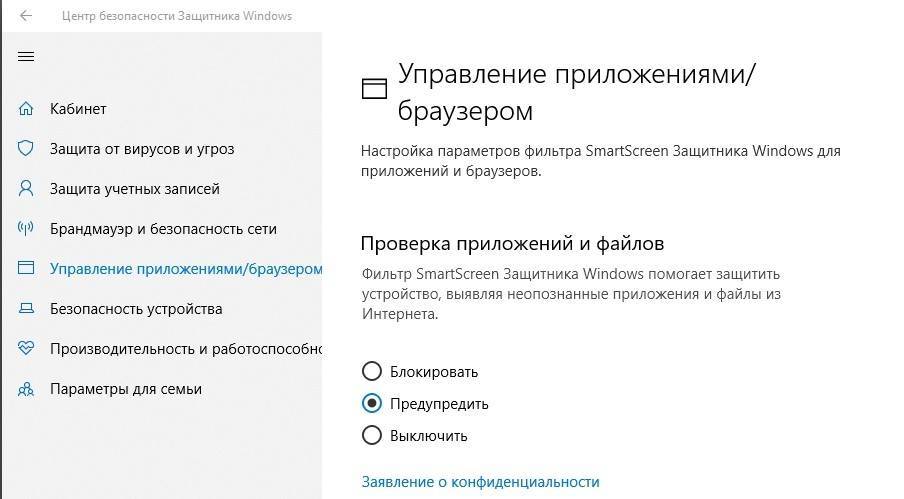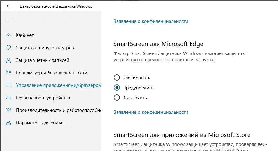 В разделе «Управление приложениями/браузером» будет доступен целый ряд настроек, которые включают и отключают разные опции технологии SmartScreen.
