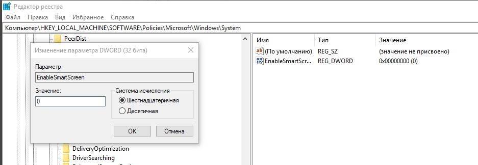 Смарт Скрин полностью отключается через Редактор реестра путем создания записи «EnableSmartScreen». Выполняется операция следующим образом:
