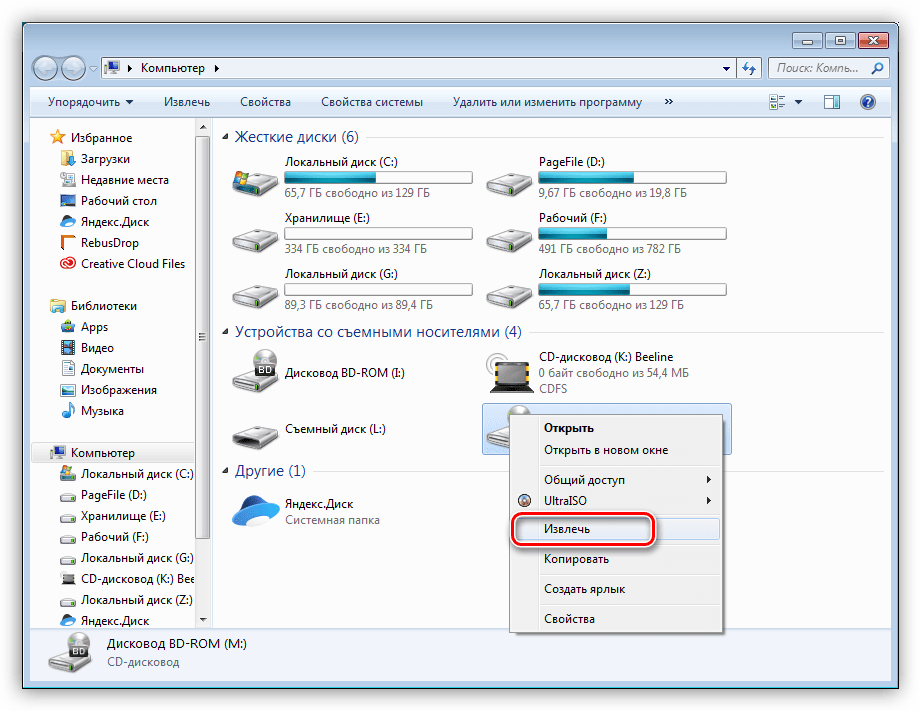 Еще один способ – использование «Проводника», а точнее, его контекстного меню. При нажатии правой кнопки мыши на приводе в папке «Компьютер» необходимо выбрать пункт «Извлечь», после чего дисковод откроется.