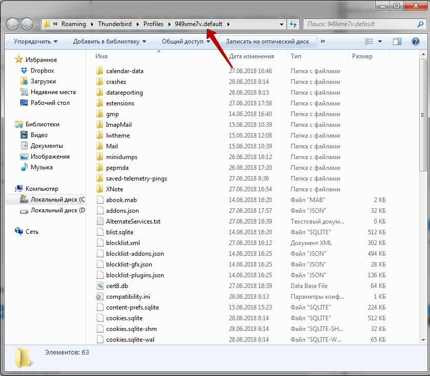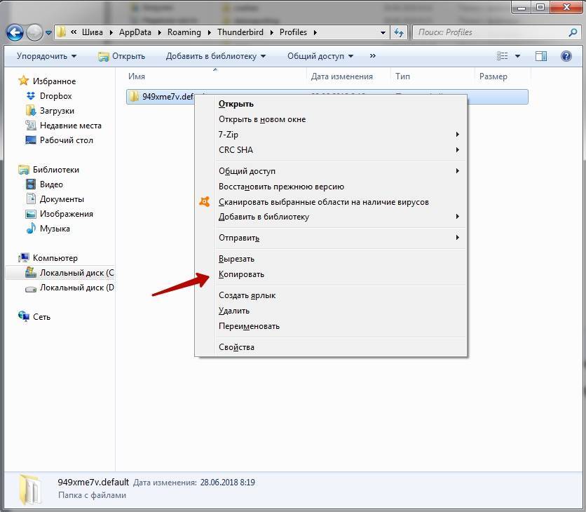 Откроется папка с профилем. Нужно скопировать эту папку полностью. Для удобства можно создать архив. Затем скопируйте эту папку, например, на флешку. И скопируйте в любую удобную папку на компьютер куда переносите вашу почту. Перед копированием закройте программу.